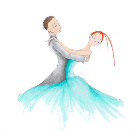 Impression d'art de danse de salon 8 x 10 po. de l'illustration originale-2 danseurs homme femme-gris aqua/turquoise-valse renard-trot-partenaires Couple paire - Etsy France