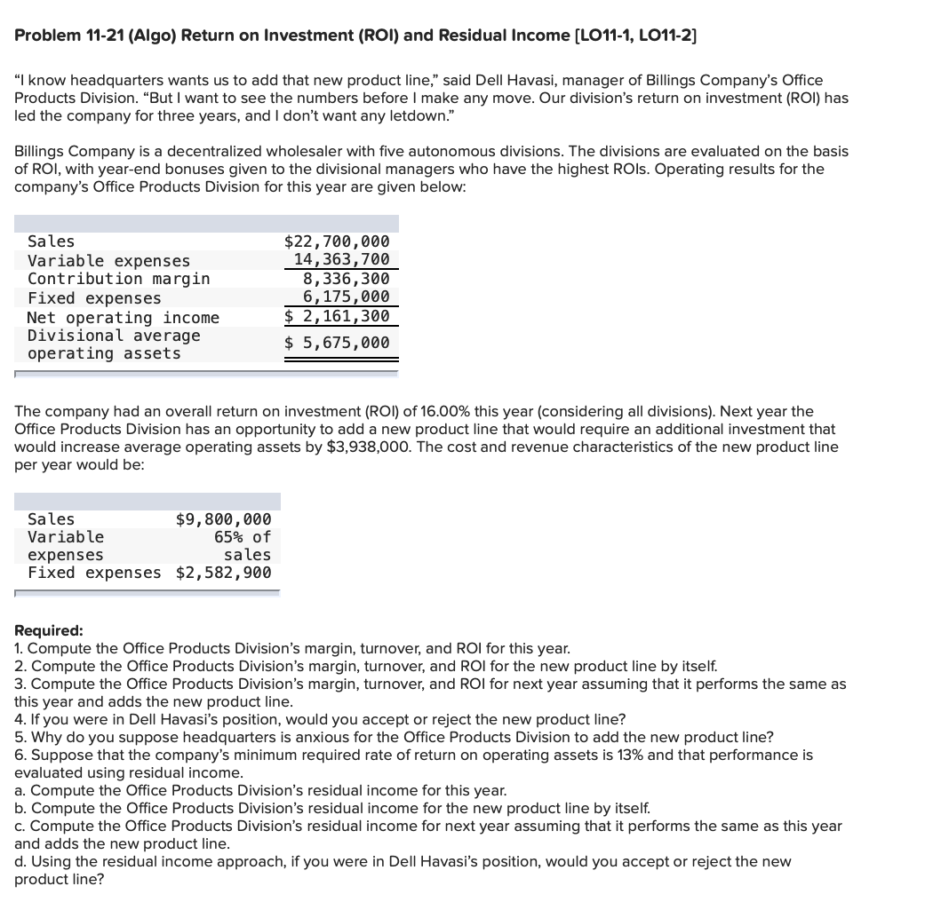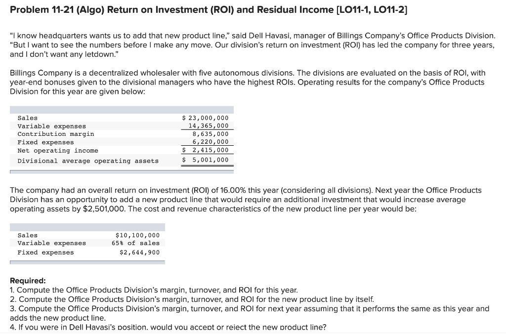 Solved Problem 11-21 (Algo) Return on Investment (ROI) and | Chegg.com