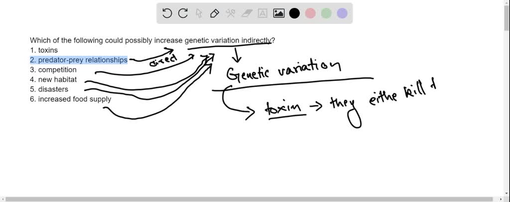 SOLVED: Which of the following could possibly increase genetic variation indirectly? 1. toxins 2. predator-prey relationships 3. competition 4. new habitat 5. disasters 6. increased food supply
