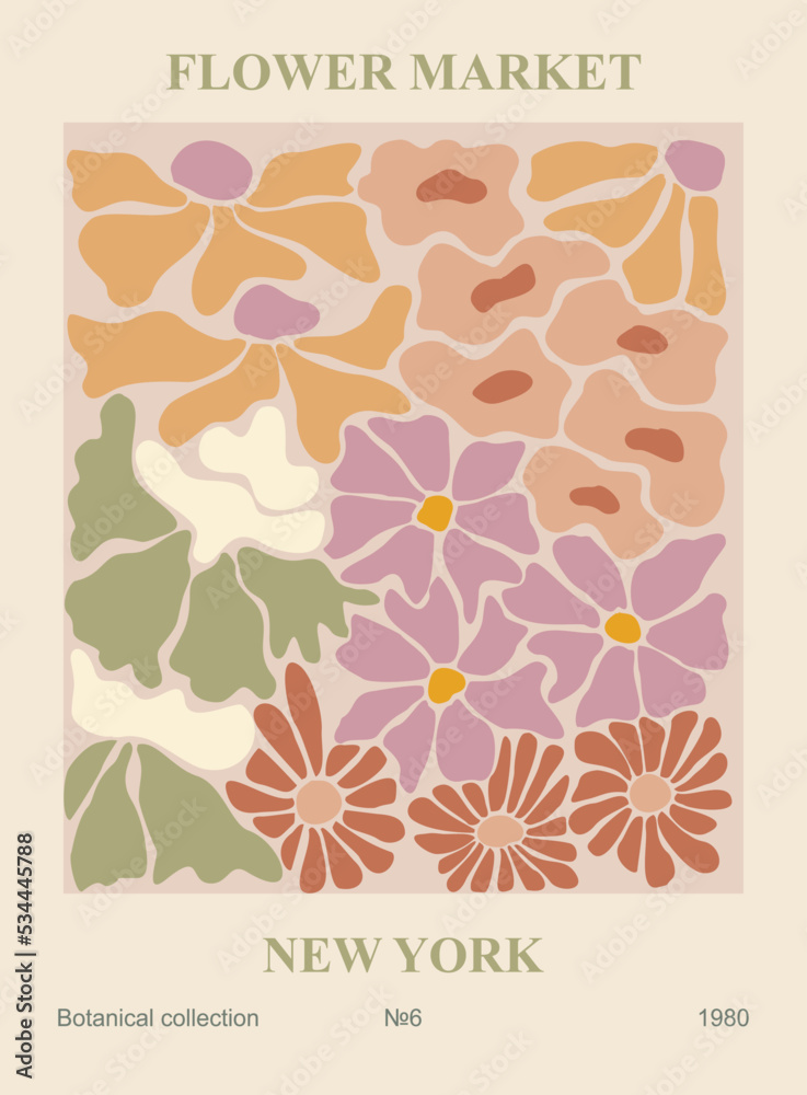 Vecteur Stock Abstract poster - Flower market New York. Trendy botanical wall art with floral design in danish pastel colors. Modern hippie naive groovy funky interior decoration, painting. Vector art illustration. |