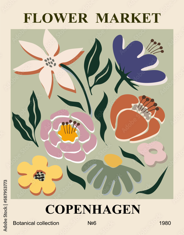 Vecteur Stock Abstract poster Flower Market print Copenhagen. Trendy botanical wall art with floral design in danish pastel colors. Modern naive groovy hippie interior decoration, painting. Vector art illustration. | Adobe Stock