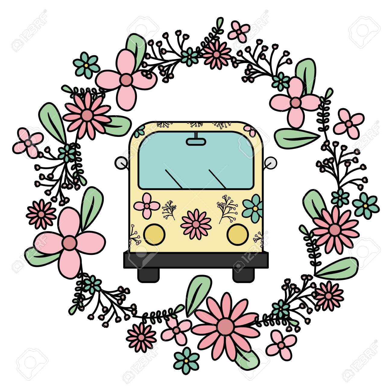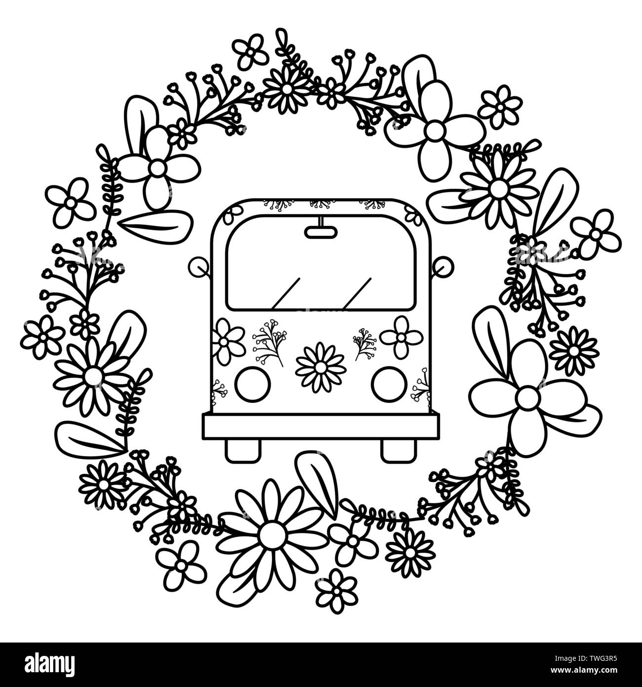 Van hippie à imprimé floral et de fleurs couronne vector illustration design Image Vectorielle Stock - Alamy
