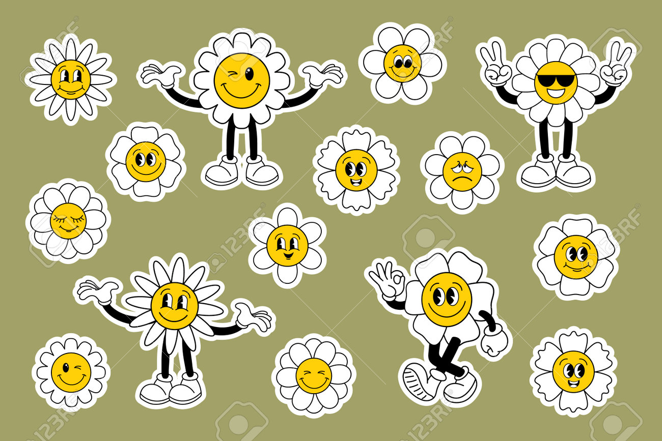 Ensemble De Personnages De Fleurs Hippies Mignons Dans Un Style Funky Rétro Années 70 Atmosphère Éléments De Rainure Style De Dessin Animé Icônes Autocollants Vecteur Clip Art Libres De Droits, Svg, Vecteurs