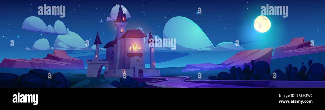 Le château de magie fantaisie à l'arrière-plan de conte de fées vecteur de nuit. Palais de princesse médiéval de conte de fées avec route. Manoir du royaume gothique au-dessus de la pleine