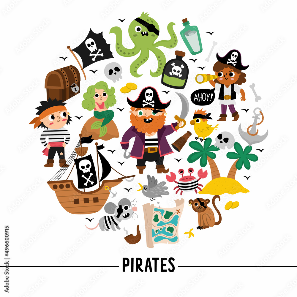 Vecteur Stock Vector pirate round frame with pirates, ship and animals. Treasure island card template or marine party design for banners, invitations. Cute sea adventures illustration with octopus, mermaid, parrot. | Adobe