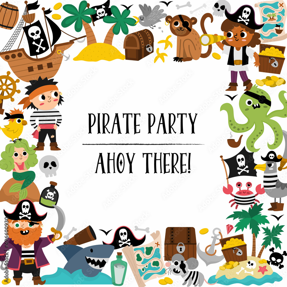 Vecteur Stock Vector pirate square frame with pirates, ship and animals. Treasure island border wreath card template or marine party design for banners. Cute sea adventures illustration with place for text. |