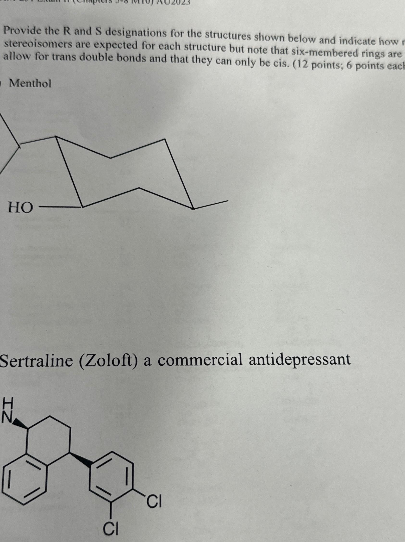 SOLVED: The molecule shown below is Sertraline (the generic name for the commercial drug Zoloft, which is used to treat depression). CH₃ 27). Circle any chiral centers in the molecule. (4 points)